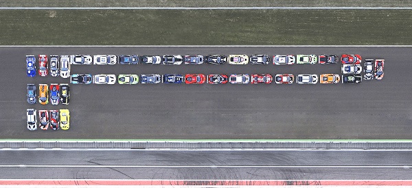 Nach einem langen Tag auf der Strecke bildeten 41 Autos das Pirelli Logo in Monza im Licht der Abendsonne. Auf der Hauptgeraden, über die sie sonst mit rund 280 km/h jagen, wurden die Autos für das Fotoshooting arrangiert. Dazu schoben fleißige Helfer sie nacheinander in die richtige Position, und statt Motoren-Gebrüll war lediglich das leise Abrollen der P Zero-Reifen auf dem Asphalt der legendären Rennstrecke zu hören.