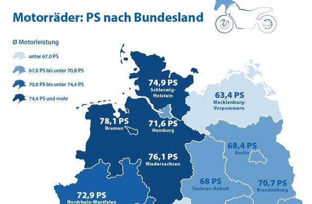 Die Motorräder mit der stärksten Motorleistung sind im Nordwesten Deutschlands zu Hause. Bremer Motorradfahrer sind mit den meisten PS unterwegs – durchschnittlich 78,1 PS. Das sind 23 Prozent mehr Motorleistung als Mecklenburg-Vorpommern (63,4 PS). Ebenfalls viel Motorleistung gönnen sich Biker aus Niedersachen (76,1 PS) und Schleswig-Holstein (74,9 PS). Mit durchschnittlich 5.610 km fahren Bremer im Schnitt auch die größte Strecke pro Jahr auf zwei Rädern.*)
