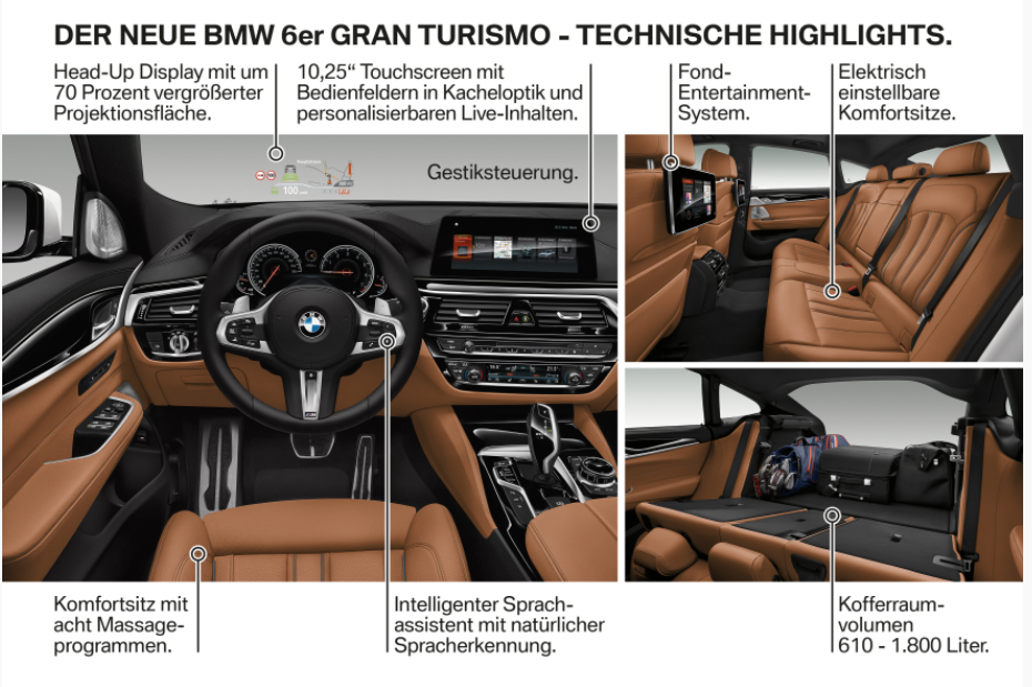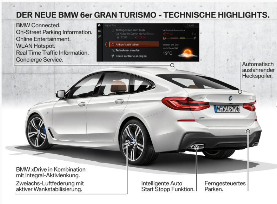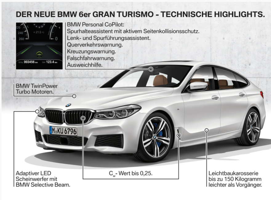 BMW präsentiert die umfangreich weiterentwickelte Neuauflage für eines der innovativsten Fahrzeugkonzepte der jüngeren Vergangenheit. Der neue BMW 6er Gran Turismo vereint den Reisekomfort einer Oberklasse-Limousine mit der faszinierenden Ästhetik eines Coupés. Die hohe Funktionalität des Karosseriekonzepts und der auf entspanntes Reisen ausgerichtete Fahr- und Raumkomfort sind Merkmale, die schon den Charakter des Vorgängers und Begründers dieser Fahrzeuggattung prägten und nun beim neuen BMW 6er Gran Turismo weiter perfektioniert wurden. Der konsequente Fortschritt gegenüber dem BMW 5er Gran Turismo zeigt sich in der sportlichen Eleganz, in besonders hochwertigen Ausstattungsmerkmalen, innovativen Bedien- und Assistenzsystemen sowie deutlich gesteigerter Dynamik und Effizienz.