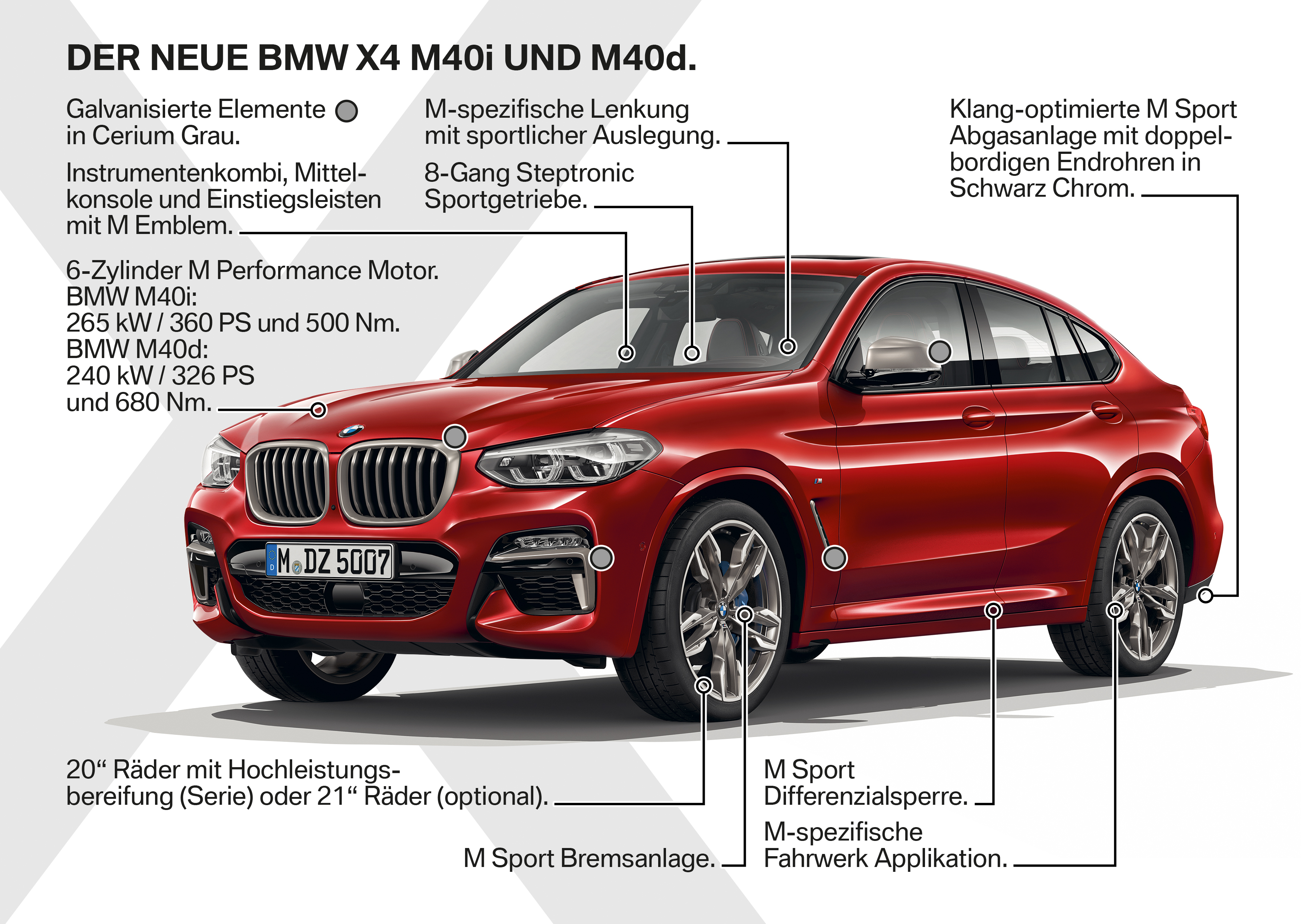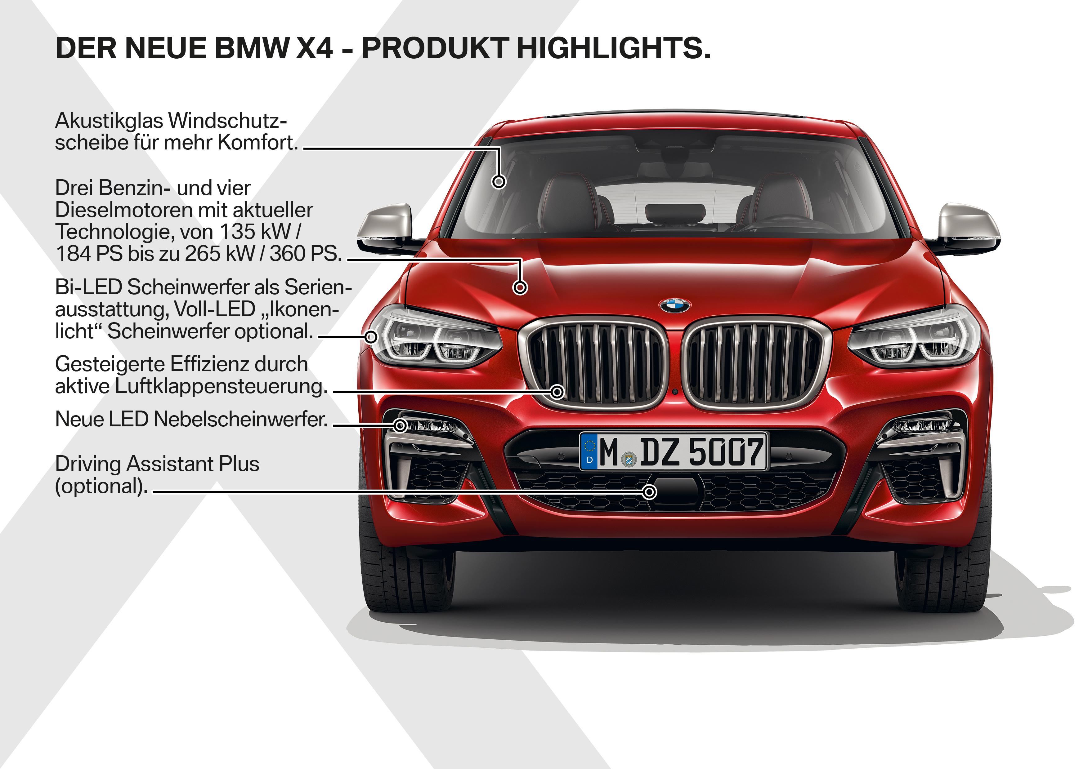 - Gezielte Individualisierung durch Modellvarianten xLine, M Sport X und M Sport. Außerdem sind erstmals für den BMW X4 auch exklusive Angebote aus dem BMW Individual Programm für eine detailliert am persönlichen Stil des Kunden ausgerichtete Konfiguration verfügbar.