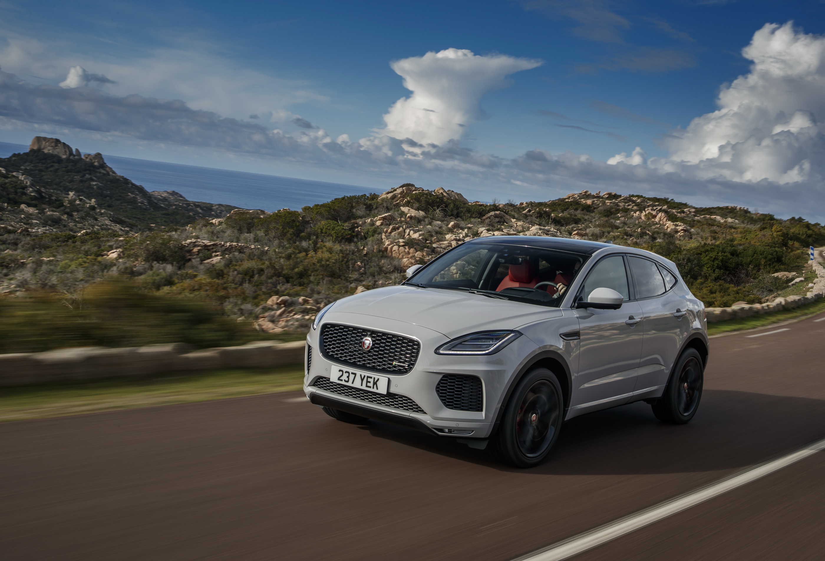Der typische Jaguar Kühlergrill, die muskulösen Proportionen und kurzen Überhänge sowie die „schnelle“ und geschwungene Dachlinie lassen zusammen mit der charakteristischen Seitenfenster-Grafik die Jaguar Sportwagen-DNA deutlich in Erscheinung treten. Optionale 21-Zoll-Felgen und das ebenfalls auf Wunsch lieferbare Panoramadach mit zur Wagenfarbe kontrastierender schwarzer Tönung verleihen dem Jaguar E-PACE einen besonders rassigen Charakter. Das dynamische Exterieur-Design findet innen seine Entsprechung in einer nur leicht erhöhten „Sports Comand“-Sitzposition. Der geschwungene Haltegriff auf der Mittelkonsole ist eine direkte Anleihe aus dem Sportwagen F-TYPE.